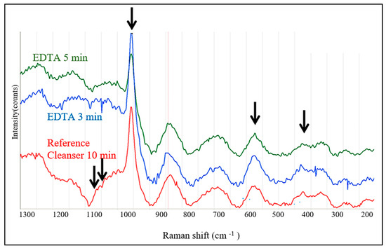 Comparison of Raman spectra after treatment by EDTA for 3 min and 5 min compared to the reference sample, HTT, stimulated by Cleanser for 10 min. The arrows indicate (PO4)−3 peaks.