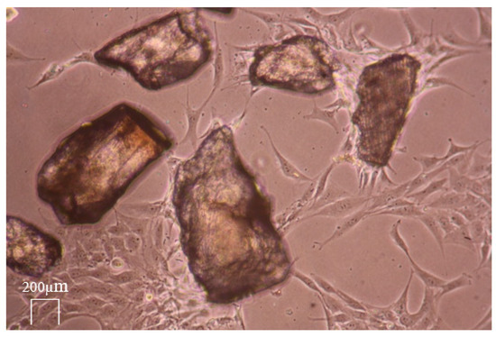 The locomotion activity of the MG 63 cells in grit HTT lysate after exposure to 0.6 N HCl was observed. The MG 63 cells migrated to the scaffold and concentrated on its surface (see Figure 11, Figure 12 and Figure 13). A large proportion of the scaffolds in the culture exhibited this property. The migration rate of the cells to the grain corresponded to approximately 60 µm/h. (Data by time-lapse imaging after 12, 24, 48, 72, and 120 h).