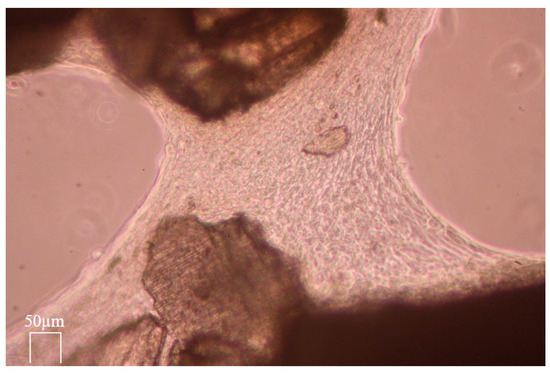 Figure 11 shows that the migration occurred only on some parts of particles. The reason seems to be the consequence of local contamination by detritus and/or the presence of enamel, which blocked the possibility of the osteogenic activity of the dentin matrix. The areas without detritus after grinding showed an increase in osteogenic activity, manifested by a higher concentration of migrating cells. The enamel did not allow exposure of the dentin matrix and, thus, reduced the migratory effect. Figure 13 demonstrates the ultimate result of the increase in osteogenic activity after leaching via the formation of organized cross-links between the exposed ADDM particles. This enhancement was related to the demineralization via the removal of Ca and P ions from the HTT grain surface.