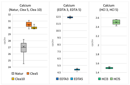 Statistical analysis of the level of Ca concentration values in the dentin area of the untreated HTT and after demineralization with the Cleanser, EDTA and HCl solutions. (Natur—untreated HTT—the 1st sample), Clea5 (HTT treated by chemical disinfection exposure to Cleanser solution for 5 min—the 2nd sample), Clea10 (HTT treated by chemical disinfection exposure to Cleanser solution for 10 min—the 3rd sample), EDTA 3 (HTT treated by exposure to EDTA for 3 min—the 4th sample), EDTA 5 (HTT treated by exposure to EDTA for 5 min—the 5th sample), HCl3 (HTT treated by exposure to HCl for 3 min—the 6th sample), and HCl5 (HTT treated by exposure to HCl for 5 min—the 7th sample).
