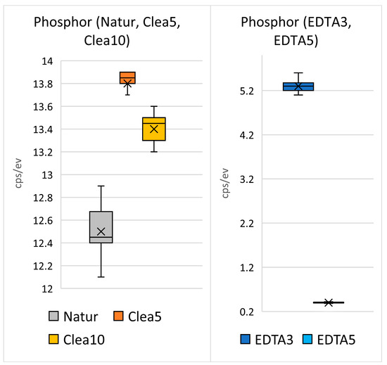 Statistical analysis of the levels of P concentration values in the dentin area of the untreated HTT and after the demineralization with Cleanser and EDTA solutions. Statistical evaluation of P after 3 and 5 min treatment in HCl was not evaluated because zeroth P values were observed after HCl stimulation (Figure 6). (Natur—untreated HTT—the 1st sample), Clea5 (HTT treated by chemical disinfection exposure to Cleanser solution for 5 min—the 2nd sample), Clea10 (HTT treated by chemical disinfection exposure to Cleanser solution for 10 min—the 3rd sample), EDTA 3 (HTT treated by exposure to EDTA for 3 min—the 4th sample), and EDTA 5 (HTT treated by exposure to EDTA for 5 min—the 5th sample).