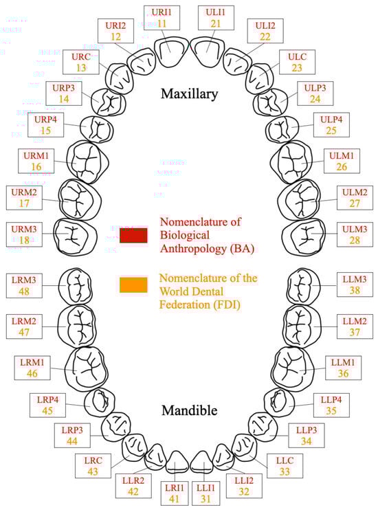 Numbering and labeling of teeth in accordance with the FDI World Dental Federation (FDI: Fédération Dentaire Internationale, in French) convention and the norms used in Biological Anthropology (BA).