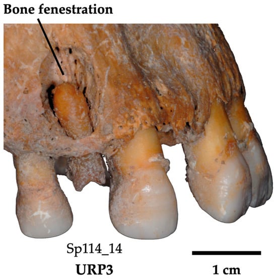 Bone fenestration in the upper left sector of individual Sp114. The destruction of the bone in the periapical area of this URP3 is caused by an infection (i.e., dental periapical abscess) due to a carious lesion with pulp exposure.