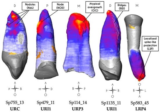 Three-dimensional thickness maps showing the five types of cementum apposition (from left to right): nodules (e.g., Sp755_13), node (e.g., Sp479_11), atypical overgrowth (e.g., Sp114_14), ridges (highlighted using thin undulating white lines; e.g., Sp1135_11) and localized spike-like projection (e.g., Sp583_45). Abbreviations stand as follows: O = occlusal; P = palatal; L = lingual; B = buccal; M = mesial; D = distal; A = apical. The orientation of the tooth Sp583_45 in the figure takes into account its rotated position within its bony socket with its actual buccal surface facing mesially (See Supplementary Information S1).