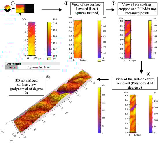 Once the region of interest was fixed in x and y, the z-axis range was set in brightfield mode by determining the lowest and highest elevation points. In confocal mode, the light intensity is set before the beginning of the acquisition. The recorded topographic surface was considered as a raw surface that needed to be treated before extracting the 2D and 3D profiles using the SensoMap working software (version 8.2, Sensofar Group, Barcelona, Spain). SensoMap is a tool based on Digital Surf’s Mountains technology, which is a surface analysis platform. It enables advanced analysis of surface data and generates customized reports, providing detailed insights into the characteristics of cementum surfaces. In a first step, the missing or unmeasured points were estimated using a specific algorithm (interpolation from surrounding points). A series of processing steps were recorded in a saved workflow (=template), which was applied the same way for each of the processed topographies. (i) Data acquisition—the process begins by capturing a layer of data from SensoScan, providing us with the initial 3D representation of the cementum surface. (ii) Surface levelling—in this stage, the acquired data are transferred to the SensoMap software (version 8.2, Sensor Group, Barcelona, Spain). The first task is to ensure that the surface is level. This is a crucial step to correct any irregularities in the original data, ensuring accuracy in subsequent analyses. (iii) Cropping and data enhancement—to focus our analysis on the relevant area, we cropped the data as needed. Additionally, any regions with non-measured points (NM) were filled in. This enhancement is vital for a comprehensive 3D model. (iv) Curvature removal—the cementum surface may have variations caused by the curvature related to the underlying root shape. To mitigate this, we applied a polynomial of degree 2, effectively removing these curvatures. This step resulted in a straightened 3D map, allowing for a clearer and more precise analysis. (v) Final 3D topography—once the curvature of the underlying dentine root surface was accounted for, we obtained the final 3D topography of the cementum surface. These data provide a detailed representation of the surface (Figure 6).