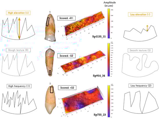 Among the 12 teeth of the hyperfunctional group, three profiles look similar and have already been encountered in the impacted group (i.e., Sp755_13 and Sp755_23). They are characterized by the nodule and node apposition types. The surface condition was scored +S2, indicating a surface with high amplitude, a smooth aspect with low frequency of patterns (e.g., Sp491_11 and Sp810_23). The other profiles have a rough surface texture, scored R (Figure 11).