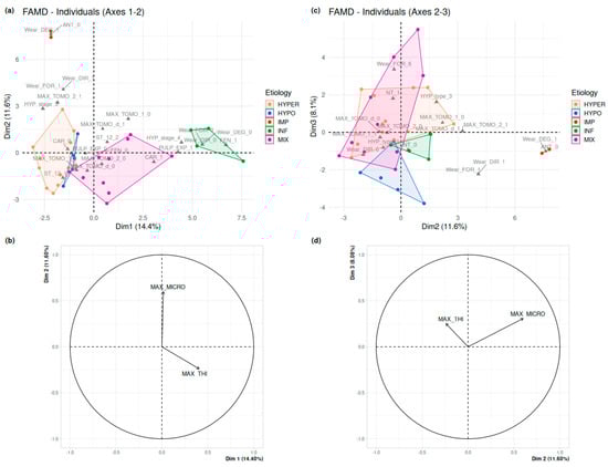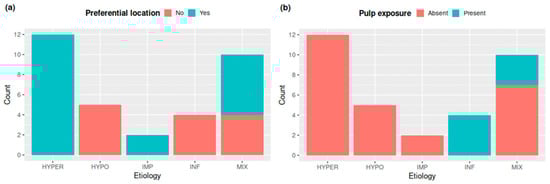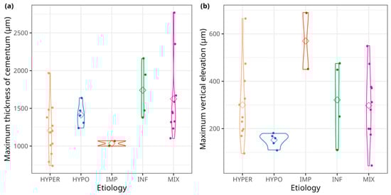The link between the etiologies and each explanatory variable was first investigated using appropriate graphical representations, depending on the type of the variable—violin plots and stripcharts for continuous variables, and barplots for ordinal and qualitative traits. Then, a Factor Analysis of Mixed Data, or FAMD [62], was performed on a subset of explanatory variables. This unsupervised (i.e., without a priori attribution of each tooth to an etiology) multivariate analysis aims to explore their relative strength and to identify and characterize their significant relationships. FAMD is a factorial method allowing for the analysis of datasets containing both continuous (i.e., quantitative) and categorical (i.e., qualitative) variables. It can thus be considered as a combination of Principal Component Analysis and Multiple Correspondence Analysis. The qualitative variables showing no variability (always absent or always present) or too little variability (only one presence or only one absence) were discarded upfront. In addition, an iterative algorithm for missing data imputation was applied to fill in the rare instances of missing values [63], for instance, due to the ante-mortem loss of the tooth crown in case of a carious lesion in an infected tooth. Biplots of specimens and factor levels were represented for the first three principal axes, and convex hulls were then drawn for each etiology group. In the end, FAMD enabled an efficient visualization of potential relationships among variables and associated groups, providing an overall perspective on how various dental features combine and distinguish themselves in comparison to the presumed etiologies.