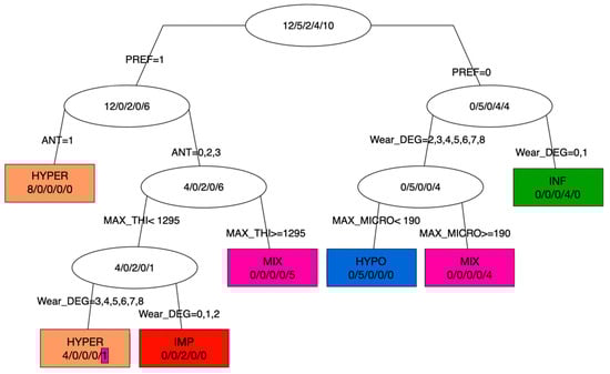 Finally, a classification tree [64] was built to explain the etiology groups. A decision tree aims to create classes of specimens (“terminal leaves”) using a combination of dichotomous splits on explanatory variables (the “nodes” of the tree), in such a way that the classes are optimally homogeneous relative to the etiologies. The algorithm utilizes all the quantitative and qualitative data collected on the sample to best classify the teeth in the etiology groups, based on thresholds of key features that will discriminate them from other groups (i.e., numerical threshold for a quantitative variable or the state ‘presence’ or ‘absence’ for an ordinal variable). A terminal group is considered as “pure” when specimens from only one etiological group have clustered together. Additional technical details about the criteria retained to grow the tree are available in Supplementary Information S2.