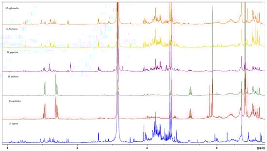 Overlaid 1H-NMR spectra of the methanol extracts of M. officinalis (orange color), S. fruticosa (yellow color), M. piperita (purple color), O. dubium (green color), T. capitatus (red color), and S. cypria (blue color).