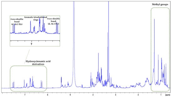 1H-NMR spectrum of M. officinalis. Signals from methyl groups and hydroxycinnamic acid derivatives are indicated with green boxes. Zoom-in of the aromatic region.