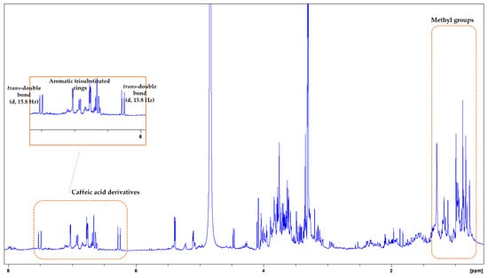 1H-NMR spectrum of S. fruticosa. Signals from methyl groups and caffeic acid derivatives are signed with orange boxes. Zoom-in of the aromatic region.