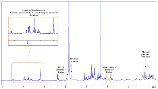 In the 1H-NMR spectrum of M. piperita, mainly signals from flavonoids, and phenolic acid derivatives were observed (Figure 4). In the aromatic region (7.60–6.10 ppm), proton signals could be assigned to (i) caffeic acid derivatives [δH: 7.51 (d, J = 16.2) and 6.27 (d, J = 16.2)/δH range: 7.05–6.61], and (ii) flavonoids (δH range: 6.96–6.78 and 6.20–6.17). Regarding the flavonoids, the observation of double doublet peaks at δH range of 3.19–2.70, and δH 5.35 leads to the assumption of the presence of flavanones. These assignments are characteristic flavanone proton signals for H-3ax/H-3eq, and H-2 of the C-ring, respectively. In the 1H-1H-COSY spectrum, the correlation peaks between the above protons were also observed (Figure S3a). Their corresponding carbon signals were recorded at δc 43.9 (C-3) and 80.4 (C-2) based on the HSQC spectrum (Figure S3b). At the δH range of 6.20–6.17 and 6.96–6.78, signals could be assigned to aromatic protons of the A- and B-rings of flavanone skeletons. Furthermore, signals of sugars were observed in the middle region (5.40–3.30 ppm) of the 1H-NMR spectrum. Indeed, anomeric protons were found at δH ca. 4.95–4.93 (d, J = 7.9 Hz; HSQC: δc ca.100.9–100.8) and 4.69 (br s; HSQC: δc 101.9), as well as at δH around 1.20, a double peak (J = 6.1 Hz; HSQC: δc 17.7) could be attributed to a methyl group of rhamnose. Thus, we could assume that flavanones could be presented in their glycoside forms. Previous studies reported that M. piperita is rich in flavanones, especially eriodictyol, naringenin, and hesperidin derivatives [43,44]. It is noteworthy to mention that eriocitrin (eriodictyol-7-rutinoside) is one of the major compounds of flavanone derivatives of M. piperita [43,44]. On the contrary, flavonols and dihydroflavonols have been reported less in previous studies [43]. Phenolic acids, mainly caffeic acid and its derivatives (e.g., chlorogenic acid and rosmarinic acid), are found in M. piperita extracts [43,44].
