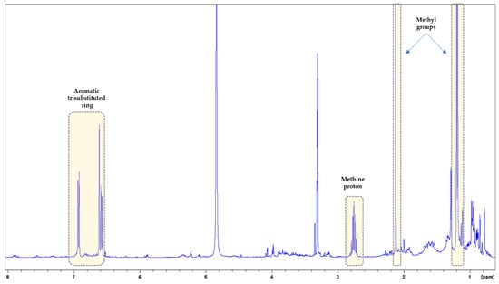 In the NMR spectra of T. capitatus, signals from terpenoids, flavonoids, and phenolic acids were observed. Major signals of phenolic monoterpenes were also detected in its 1H-NMR spectrum: (i) aromatic protons of trisubstituted rings at δH range 7.00–6.50 ppm, (ii) methine protons at δH around 2.76, and (iii) methyl protons at δH 2.22–2.10 and 1.19–1.13 (Figure 6). In the 1H-1H-COSY spectrum, the correlation peaks between the above protons were also observed (Figure S5a). Their corresponding carbon signals were also observed in the HSQC spectrum (Figure S5b). In general, terpenoids, flavonoids, and phenolic acids have been reported in T. capitatus [48]. Phenolic monoterpenes, namely carvacrol and thymol, have also been found in T. capitatus extracts, apart from its essential oil [48].