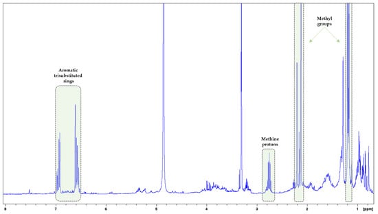 1H-NMR spectrum of T. capitatus. Signals of phenolic monoterpenes are indicated with green boxes.