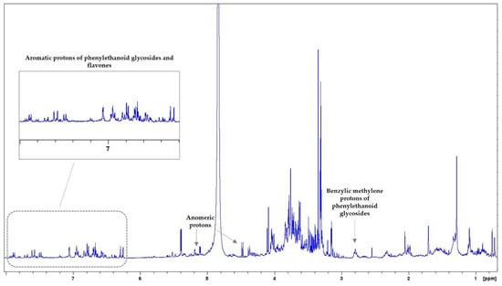 A preliminary screening of the methanol extracts was first obtained by 1H-NMR spectra, and the phytochemical categories of their constituents were identified based on peaks in specific regions. The comparative 1D NMR fingerprints are presented in Figure 1. In addition, 2D NMR spectra (COSY and HSQC) were acquired in order to provide a better overview (Figures S1–S6).