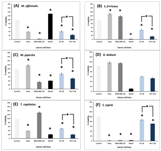 Graph representation of cell viability (%) in HeLa, MDA-MB231, SkoV3, HT-29, and HCT-116 cancer cell lines following treatment with ethanolic extracts from M. officinalis (A), S. fruticosa (B), M. piperita (C), O. dubium (D), T. capitatus (E), and S. cypria (F) at a concentration of 1000 μg/mL for 72 h. The MTT assay was performed in triplicate, and at least three independent experiments were performed for each extract. The graphs represent the mean value of the percent viability in the three independent experiments compared to the control (0.1% DMSO), which has 100% viability. All statistically significant changes (Student t-test, p value < 0.05) are indicated by an asterisk (*).