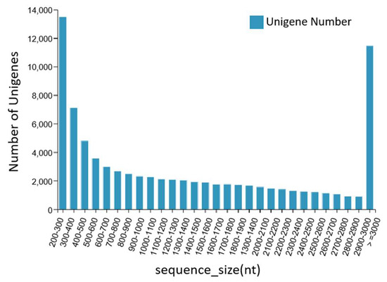 The DNBSEQ platform was used to sequence the dorsal skin, the lateral skin, and the peritoneal wall layer tissues of T. stenura. A total of 56.13 Gb of data was obtained, and the basic Unigene information was obtained by assembling the results. After clustering assembly, there were a total of 81,868 All-Unigenes with a total length of 123,827,585 bp, an N50 of 2514 bp, and a GC content of 43.05%. The distribution information showed that Unigenes contained 200 bp or more, with 13,497 Unigenes being between 200 and 300 bp and 11,447 Unigenes being greater than or equal to 3000 bp. The data assembly integrity was relatively high (Figure 1).