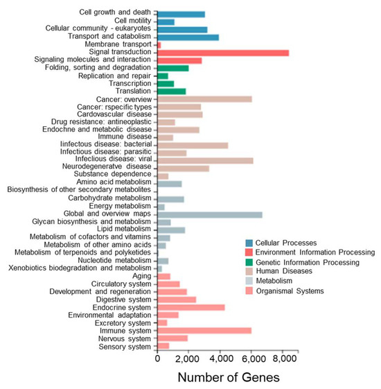 Among these enriched pathways, the ones with the most enriched genes are signal transduction (8430 Unigenes), global and overview maps (6730 Unigenes), viral infectious diseases (6157 Unigenes), cancer overview (6065 Unigenes), immune system (6034 Unigenes), bacterial infectious diseases (4539 Unigenes), the endocrine system (4338 Unigenes), transport and catabolism (3954 Unigenes), neurodegenerative diseases (3331 Unigenes), and eukaryotic cell communities (3218 Unigenes).