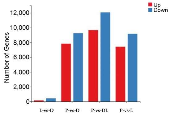 By analyzing the transcriptome results of the dorsal skin, the lateral skin, and the peritoneal wall layer of T. stenura, DEGs were obtained for different comparison groups (Figure 8). The gene expression levels of each sample were analyzed, and it was found that most genes were upregulated or downregulated (Figure 9).