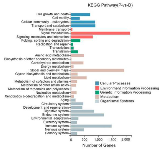 This study performed KEGG enrichment analysis on DEGs between different tissues of T. stenura using a biological pathway classification. The results are shown in Figure 13, Figure 14 and Figure 15. The DEGs between the dorsal and lateral skin were enriched in 32 branches, the DEGs between the dorsal skin and the peritoneal wall layer were enriched in 33 branches, and the DEGs between the lateral skin and the peritoneal wall layer were enriched in 33 branches. These DEG-enriched branches mainly include cell growth and apoptosis, eukaryotic cell communities, transport and catabolism, signal transduction, signaling molecules and interactions, global and overview maps, the digestive system, the endocrine system, and the immune system. Most of the DEGs in these pathways were upregulated in the dorsal skin and the peritoneal wall layer.