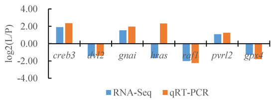 Using fluorescence quantitative PCR to validate the transcriptome data results, seven genes were randomly selected from the DEGs, and α-Tublin was used as an internal reference gene. The first-strand cDNA was obtained from the total RNA using random primers and MMLV reverse transcriptase (Promega, Madison, WI, USA). The primers were designed using Beacon Designer (v8.14) with three technical replicates and three experimental replicates set for each gene during the experimental process. qRT-PCR was performed using SYBR Green PCR Super Mix (Thermo Scientific, Wilmington, DE, USA) and the CFX96 real-time PCR detection system (Bio Rad, Hercules, CA, USA) [9].