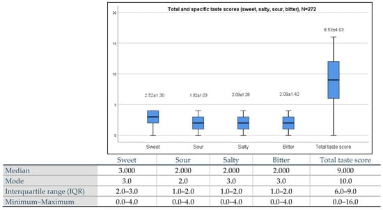 Figure 1 presents the mean total taste scores and the specific taste scores (sweet, salty, sour, and bitter) of the study population. The total taste score among the study population was 8.53 ± 4.03 (Normoguesia ≥ 9). Sweet exhibited the highest (i.e., better) specific taste score (2.52 ± 4.03), followed by salty and bitter scores (2.09 ± 1.28 and 2.09 ± 1.42, respectively), and the lowest score was sour (1.92 ± 1.03).