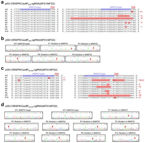 3.3. Efficient CRISPR/Cas9-Mediated Generation of Mutant Lines in M. truncatula
