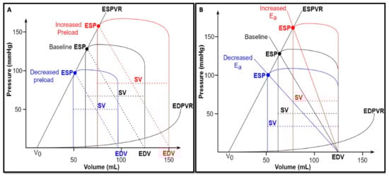 (A) Changes in preload. Under constant afterload (Ea) and contractility (Emax) conditions, a volume depletion (blue) results in a smaller and leftward-shifted PVL, with smaller EDV, ESP, and SV; on the contrary, a volume overload (red) results in a bigger and rightward-shifted PVL, with higher EDV, ESP, and SV. (B) Changes in afterload. Under constant preload (EDV) and contractility (Ees) conditions, an increased afterload (rightward shift of Ea—red) determines an increased ESP accompanied by a lower SV; on the contrary, a reduced afterload (leftward shift of Ea—blue) determines a reduced ESP accompanied by a higher SV.