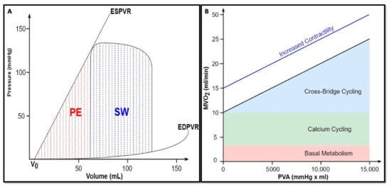 (A) Ventricular energetics. SW, stroke work, expressed by the following formula: . PE, potential energy, expressed by the following formula: . (B) Myocardial oxygen consumption. The x-axis is the PVA. The y-axis is the MVO2. The association between MVO2 and PVA is highly linear and does not change in terms of slope and y-axis intercept under conditions of constant contractility. Conversely, an enhanced contractility increased the MVO2 intercept without any change in the slope, reflecting a higher oxygen consumption due to an additional cross-bridge cycling (revised from Bastos et al. [3]).