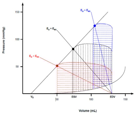 The heart and the vascular system are anatomically and functionally linked. The interaction between ventricular elastance (Ees) and arterial elastance (Ea) during the ejection phase can be mathematically expressed as follows [34]: