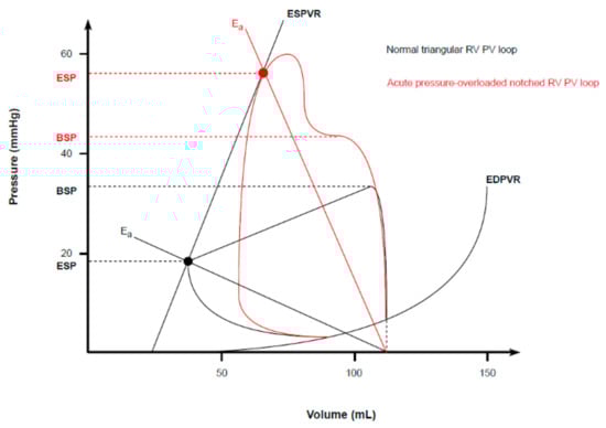 Moreover, as for the left side, a contractile dysfunction responsible for RV failure manifests itself by lowering the ESPVR relationship slope (thus reducing Emax), which in turn results in a marked reduction in both SV and ESP [47].