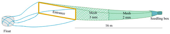 During the fishing seasons spanning from January to April across an eleven-year period from 2012 to 2022, catch data for the glass eels were collected using the same commercial boat authorized with fishing permits. This boat consistently gathered the glass eels from 400 eel nets, all of which were stationed at a fixed site (Figure 1). The eel nets, made from polyethylene thread, adopted a tapered configuration, with a gradual decrease in width from the mouth to the rear end. Each net was 16 m long and composed of two sections with different mesh sizes (3 mm and 1 mm) (Figure 2). The rear of the net mouth was connected to a floating seedling collection box, designed for the collection of the glass eels. Each net, featuring a rectangular mouth (4 m wide and 1.2 m high), was fastened to an expanded polystyrene float. This float was anchored to a fixed pile in the intertidal or subtidal zone with a 60 m rope. Net sampling was executed only at a near-surface depth of 0–3 m, as the upward buoyancy of the expanded polystyrene float allowed the net to move with the ebb and flow of the tidal currents. The orientation of the net was always towards the current to ensure consistent fishing efficiency during both ebb and flood tides. These eel nets are commonly used and are employed by nearly 95% of the licensed fishermen in the Yangtze River estuary.