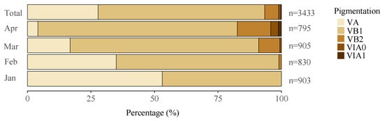 All the collected eels were identified in the glass eel stage, with pigmentation stages ranging from VA to VIA1. Specifically, stage VA is characterized by the initial appearance of pigmentation at the tip of the caudal fin and nerve cord. In contrast, stage VIA1 is marked by pigmentation extending along the dorsum from the tip of the caudal fin to just anterior of the dorsal fin. The most prevalent stage was VB1, comprising 65.6% of the total, followed by VA at 27.8%. The glass eels in stages VA and VB1 were considered new recruits in the estuary. Other stages were less represented, with VB2, VIA0, and VIA1 accounting for 5.5%, 0.9%, and 0.3% of the sample, respectively. As the fishing season progressed, there was a slight decline in the proportion of early-stage eels and a corresponding increase in later stages, indicating a clear seasonal trend (Figure 3).