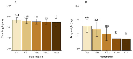 Average total length (A) and body weight (B) of the glass eels in the Yangtze River estuary across different pigmentation stages, with standard deviations shown as error bars. Data from 2012 to 2020, covering 3433 specimens, were included. Counts for each pigmentation stage are indicated in the figure.