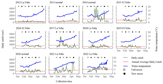 The time series data of daily catch over 11 consecutive fishing seasons revealed obvious fluctuations in daily catch, with the average daily catch ranging from 153 individuals in 2012 to 1108 individuals in 2022 (Figure 6). There were significant differences in daily catch among the different years (Kruskal–Wallis test, p < 0.001).