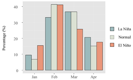 Furthermore, when analyzing the average daily catch during normal, La Niña, and El Niño years, it was found that the values were (618 ± 677), (596 ± 593), and (421 ± 263), respectively. While the mean daily catch was lowest during El Niño years, statistical analysis revealed no significant differences in catch abundance among the three groups (p = 0.15). Comparing the monthly catch data between El Niño and La Niña years, it was observed that the recruitment season tended to commence earlier during El Niño years (Figure 7).