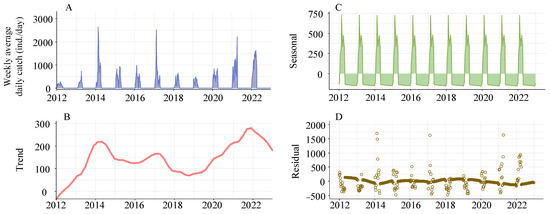 Initially, we utilized the non-parametric Mann–Kendall (MK) test to examine the monotonic trends in the weekly average of daily catches. Subsequently, we applied the seasonal-trend decomposition using Loess (STL) technique to break down the weekly series of daily catch into its fundamental seasonal, trend, and remainder components [36]. The STL method deploys a continuous Loess line for smoothing the long-term component and 52-week specific Loess lines for the seasonal component. Each component undergoes iterative fitting until the resulting trend and seasonal components no longer deviate from those of previous iterations. The model includes two smoothing parameters representing the window widths of the seasonal and long-term components [36]. We selected window widths of 52 and 153 weeks, respectively, to visually reveal trends. Generally, window widths are chosen to produce relatively smooth long-term patterns that highlight potentially significant underlying changes while reducing the residuals to white noise. In our analysis, no discernible signals were found in the residuals, thereby directing our focus to the smooth, long-term, and seasonal patterns.