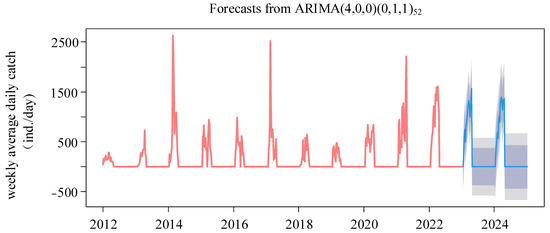 Given the distinctive seasonal and nonlinear regression attributes characterizing the daily catch of Japanese glass eels, we developed a seasonal ARIMA model by incorporating additional seasonal terms. The seasonal ARIMA model is often expressed as ARIMA(p, d, q)(P, D, Q)m, where “p”, “d”, and “q” stand for the orders of autoregression (AR), differencing, and moving average (MA), respectively. Concurrently, “P”, “D”, and “Q” denote the seasonal orders of AR, differencing, and MA correspondingly, while “m” signifies the length of the seasonal period [37].