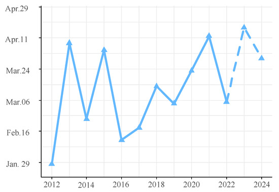 The ARIMA(4,0,0)(0,1,1)52 model was chosen for its minimal AIC value. The residuals, confirmed as white noise by the Ljung–Box test (p = 0.77) and evidenced by the ACF and PACF plots, demonstrated the model’s validity. The histogram of forecast errors demonstrated a random pattern with fluctuations around zero, reflecting the model’s efficacy (Figure S2). The model’s forecast for the upcoming two years (2023–2024), as shown in Figure 9, anticipates a consistently high level of annual glass eel catches throughout the fishing seasons of 2023 and 2024. The daily catch averages are projected to be 969 and 1008 eels, respectively. The seasonal trend is predicted to maintain a bimodal pattern, with the peak catch days falling on 17 April 2023, and 30 March 2024 (Figure 10). A Spearman correlation analysis indicated a continuing trend of seasonal delay in these peak catch dates, extending from 2016 through 2024 (r = 0.714, p = 0.03).