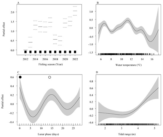 Partial effects of environmental variables on the daily catch of Anguilla japonica glass eels as determined by the final generalized additive model (GAM). The relationships are shown for (A) fishing season, (B) water temperature, (C) lunar phase, and (D) tidal range. The y-axis indicates the estimated partial effect size, with shaded areas representing the 95% confidence intervals. Rug plots show the data point density along the x-axis. Dashed lines in (A) mark the 95% confidence intervals. In (C), new and full moons are indicated by filled and open circles, respectively.