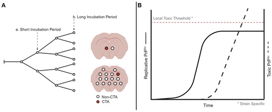 Clinical target areas (CTAs) are hypothesized to be areas of the brain that, when reached by PrPSc, lead to the development of clinical signs and ultimately the death of the host [76]. The time between the onset of prion replication within the brain and the development of clinical signs is known as the replication phase. The targeting of prions to CTAs determines the length of the replication phase within the brain; CTAs constitute a minority of the neurons within the brain and are strain specific as prion strains can differ in the clinical presentation of disease (Figure 1A). Altering the route of inoculation altered the length of the replication phase, suggesting that the pathway to a proposed CTA may vary in complexity [76,77].