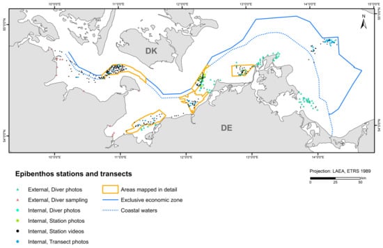 A good environmental status in our oceans is more important than ever. The Baltic Sea is particularly vulnerable to anthropogenic pressures due to its unique and fragile ecosystem (involving marine and limnic influences, a shallow depth, and limited water exchange through the shallow Strait system) [1,2]. Over the past century, the Baltic Sea has experienced human-induced regime shifts towards a eutrophic state with altered species composition [3], affecting entire food webs [4]. To overcome transnational challenges, regional regulatory frameworks were created to protect marine ecosystems. The Marine Strategy Framework Directive (MSFD, 2008/56/EC [5]) was initiated at the EU level to protect, conserve, and, where feasible, restore the marine environment. Among other things, the Directive requires EU member states to assess and monitor the current ecological status of their marine waters, with the aim to implement measures to reduce pressures as well as monitor their effectiveness. Benthic habitats and their specific benthic communities (together considered as biotopes) are of ecological importance as integral parts of the food web, providing breeding, nursery, and feeding grounds for benthic and pelagic species, as well as migratory birds, and may even represent a biodiversity hotspot [6]. Consequently, the Directive considers the seafloor and its inhabitants under Descriptor 1 (“Benthic Habitats”) and Descriptor 6 (“Seafloor Integrity”) with the view that benthic ecosystems and physical disturbance as well as loss of the seabed should be avoided, and that they should not be adversely affected (MSFD Annex I). To implement the requirements of the MSFD, but also other EU legislation and regional programmes, e.g., the Habitats Directive (HD, Article 11, 92/43/EEC [7]) and the Baltic Sea Action Plan set by HELCOM (Baltic Marine Environment Protection Commission, or shortly, Helsinki Commission), reliable full coverage maps of the distribution and extent of benthic habitats as well as their changes over time are essential. The respective regulations are based on different habitat and biotope classification systems which have been adapted to each other over time. For the Habitats Directive, delimitation rules for habitat indication had to be created [8], while the MSFD is based on the European Nature Information System (EUNIS), and HELCOM developed its own system (HUB—HELCOM Underwater Biotope and Habitat Classification [9]).
