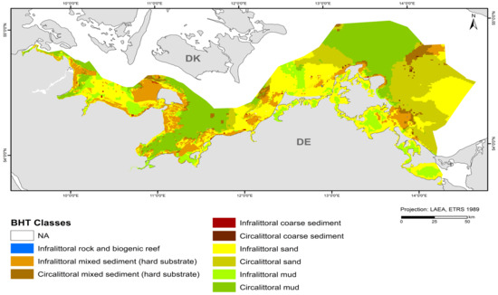 The assessment within the framework of the MSFD must be carried out separately for benthic broad habitat types (BHTs) and other habitat types (OHTs) [10]. Examples of BHTs, which are specified according to the EU Commission Decision (2017/848/EU [11]), are “Infralittoral/circalittoral rock and biogenic reef”, “Infralittoral/circalittoral mixed sediment”, “Infralittoral/circalittoral coarse sediment”, “Infralittoral/circalittoral sand”, and “Infralittoral/circalittoral mud”. The delimitation of these habitats is based on the definition of the European Nature Information System, EUNIS, and corresponds to EUNIS level 2 (ending at level 3 with regard to the Baltic Sea). EUNIS covers, in a hierarchical way, marine benthic habitats with their sedimentological and biological components. Infralittoral refers to the light-flooded zone that allows for the growth of vascular plants and green algae [12]. In contrast, the circalittoral is not sufficiently flooded with light. EUNIS also distinguishes between the offshore circalittoral and the (nearshore) circalittoral. However, the offshore circalittoral is not relevant in Germany.