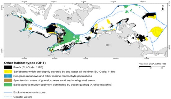 Additional benthic habitat types (so-called other habitat types, OHTs) can be selected by the respective EU member state to be assessed separately from BHTs, e.g., due to their ecological relevance as protected biotopes [10]. Such OHTs for German marine waters include biotope types according to §30 of the German Federal Nature Conservation Act (BNatSchG), according to the European Habitats Directive (92/43/EEC), as well as the Baltic Sea-wide HELCOM Red List types [13]. Relevant OHTs of the German Baltic Sea are “species-rich areas of gravel, coarse-sand and shell-gravel areas”, “seagrass meadows and other marine macrophyte populations”, “reefs”, “sandbanks which are slightly covered by sea water all the time”, and “Baltic aphotic muddy sediment dominated by ocean quahog (Arctica islandica)”.
