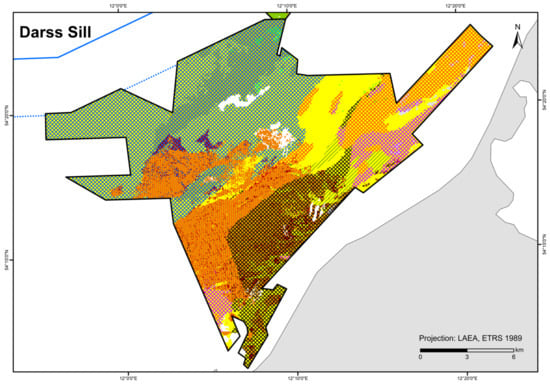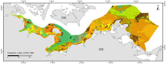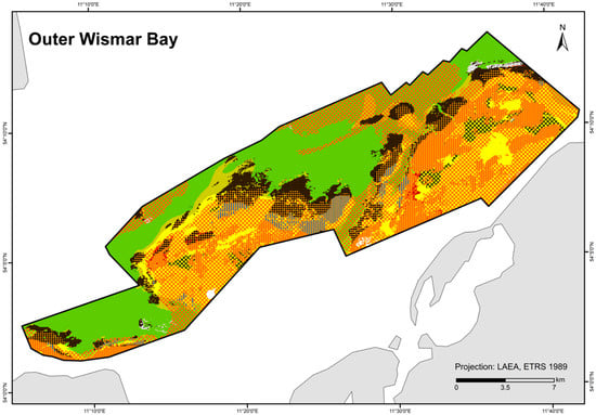 A total of 84 HUB biotope types could be modelled in the detail areas and the entire German Baltic Sea (Table 7). Figure 6 shows the HUB biotope map for the German Baltic Sea, and Figure 7, Figure 8 and Figure 9 show the HUB biotope maps for the detail areas in Mecklenburg-Western Pomerania (for more information on the detail areas in the EEZ, see [26,27]). The colours represent sediment types and the shadings represent benthic communities. NAs result from non-evaluable data in the boulder distribution maps and from sediment types that were not included in the model (due to missing benthological ground truthing) and therefore could not be predicted. However, this accounts for only about 8 km2 in the detail areas of “Kadet Trench”, “Outer Wismar Bay”, “Darss Sill”, and “Plantagenet Ground”.