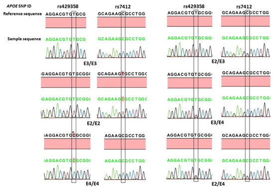 Representative DNA-sequence chromatograms of APOE genotypes based on rs429358 (T>C) and rs7412 (C>T) variants. The position of the nucleotide change is boxed.