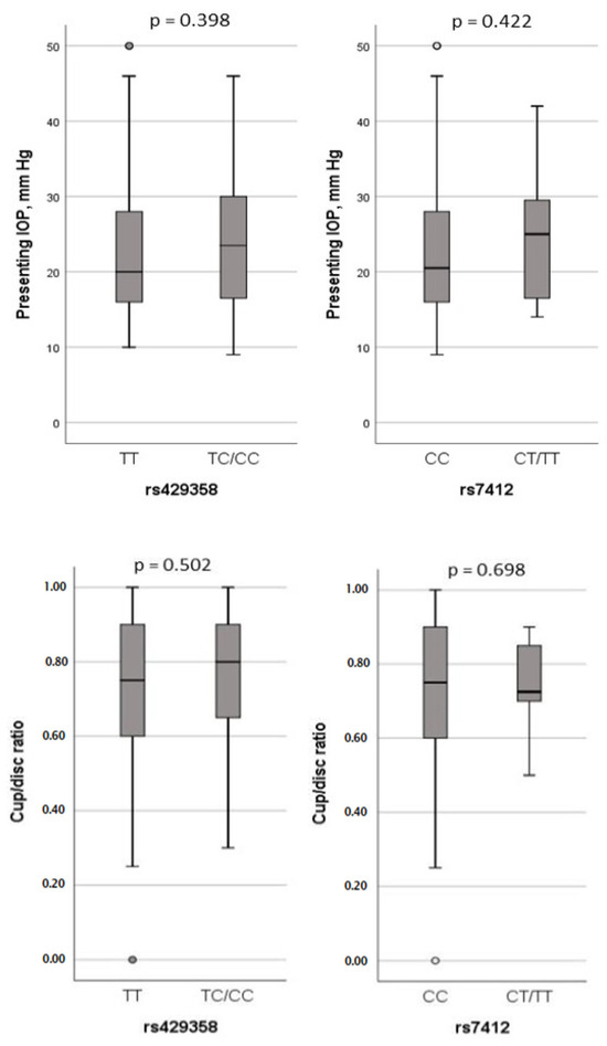 Specifically, for the rs429358 polymorphism, where T is the reference allele and C is the alternate allele, we observed C allele frequencies of 0.1 in the controls and 0.09 in the POAG cases within our cohort. This frequency was higher than in Europeans (0.07) and Asians (0.037), but lower than in Africans (0.13) and African Americans (0.13), according to NCBI ALFA allele frequency data. Notably, our study did not reveal any allelic or genotype associations of rs429358 polymorphism with POAG. Additionally, this polymorphism did not have an impact on IOP or cup/disc ratio.