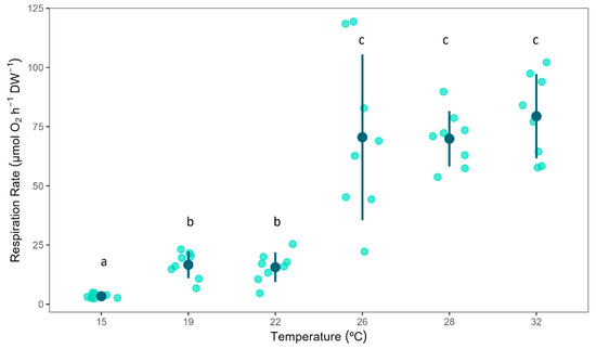 Temperature had a significant effect on C. nucula respiration rates (F(5,42) = 82.76, p = <0.001). Sponge respiration rates significantly increased with temperature (Figure 1). The lowest respiration rates were measured in the 15 °C treated sponges, while the highest respiration rates were observed in the 26 °C treatment group (2.73 ± 0.59 vs. 75.1 ± 29.93 µmol O2 h–1 g (AFDW)–1, mean ± 95% CI), revealing a clear and responsive relationship between temperature variations and sponge respiration. Sponge respiration rates under the 15 °C treatment were significantly lower than those of all the other treatments groups; while the respiration rates for the 26, 28 and 32 °C treatments (with non-significant differences among them) were significantly higher than the respiration rates measured in the 19 and 22 °C treatments (Figure 1).