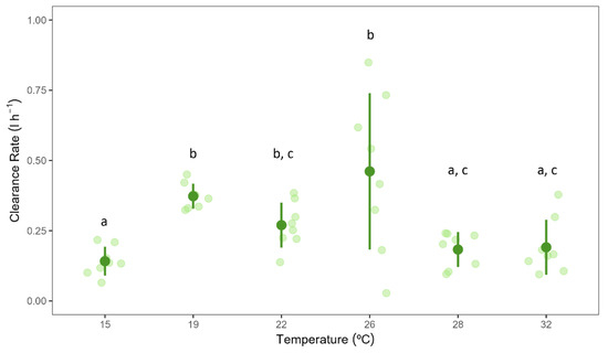 Clearance rates of Chondrilla nucula measured at six different temperatures. Bars show mean values ± 95% CI. n = 8. Letters indicate significant differences among temperature treatments.