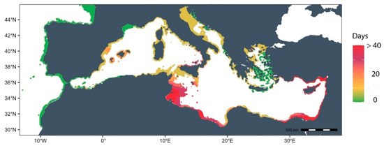 The thermal risk map (Figure 3) revealed that over 75% of the Mediterranean coast experiences 20 or more days per year with temperatures exceeding 28 °C. The southern coast of the basin, especially the Tunisian and eastern Mediterranean coast, exhibits the highest incidence of extreme temperatures. Conversely, the southern Aegean Sea, the Croatian coast, the Gulf of Lion, and the Alboran Sea maintain annual temperatures below this threshold. The remaining coastline, with a particular emphasis on northern Sicily, registers between 15 and more than 40 days of elevated temperatures.